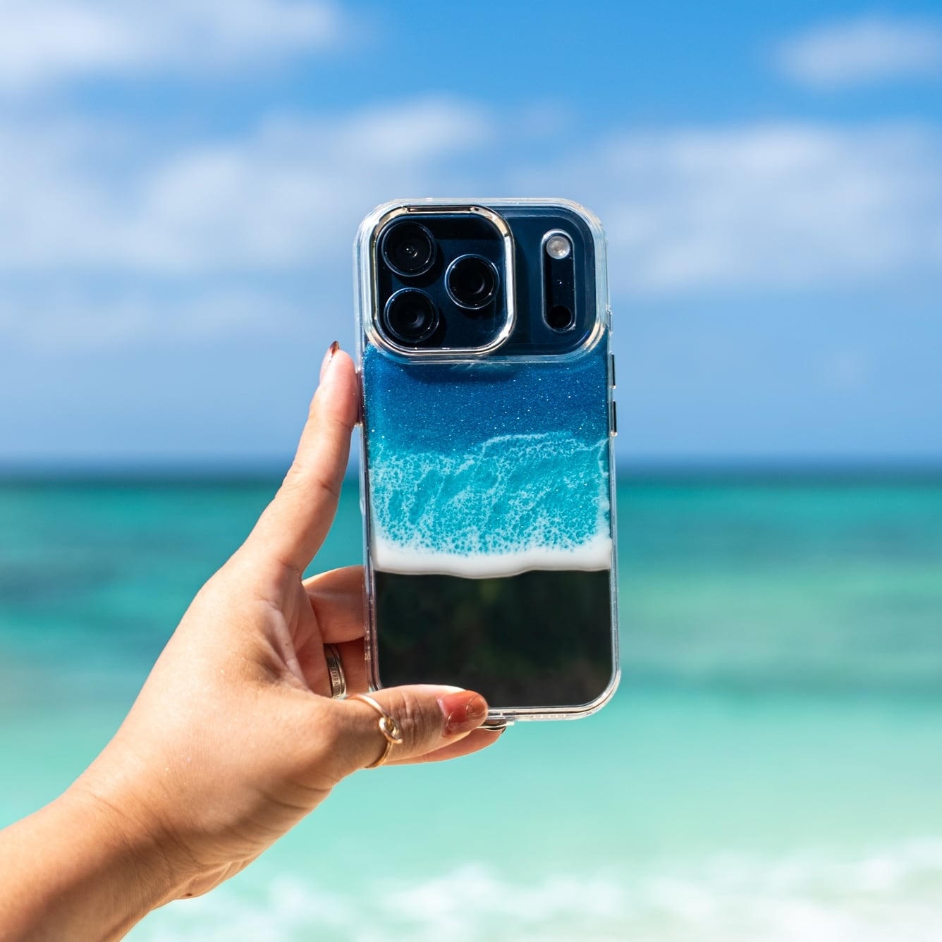 iPhoneミラーケースの上に沖縄の海をイメージして2液式エポキシ樹脂で制作した[海レジンアート]です。